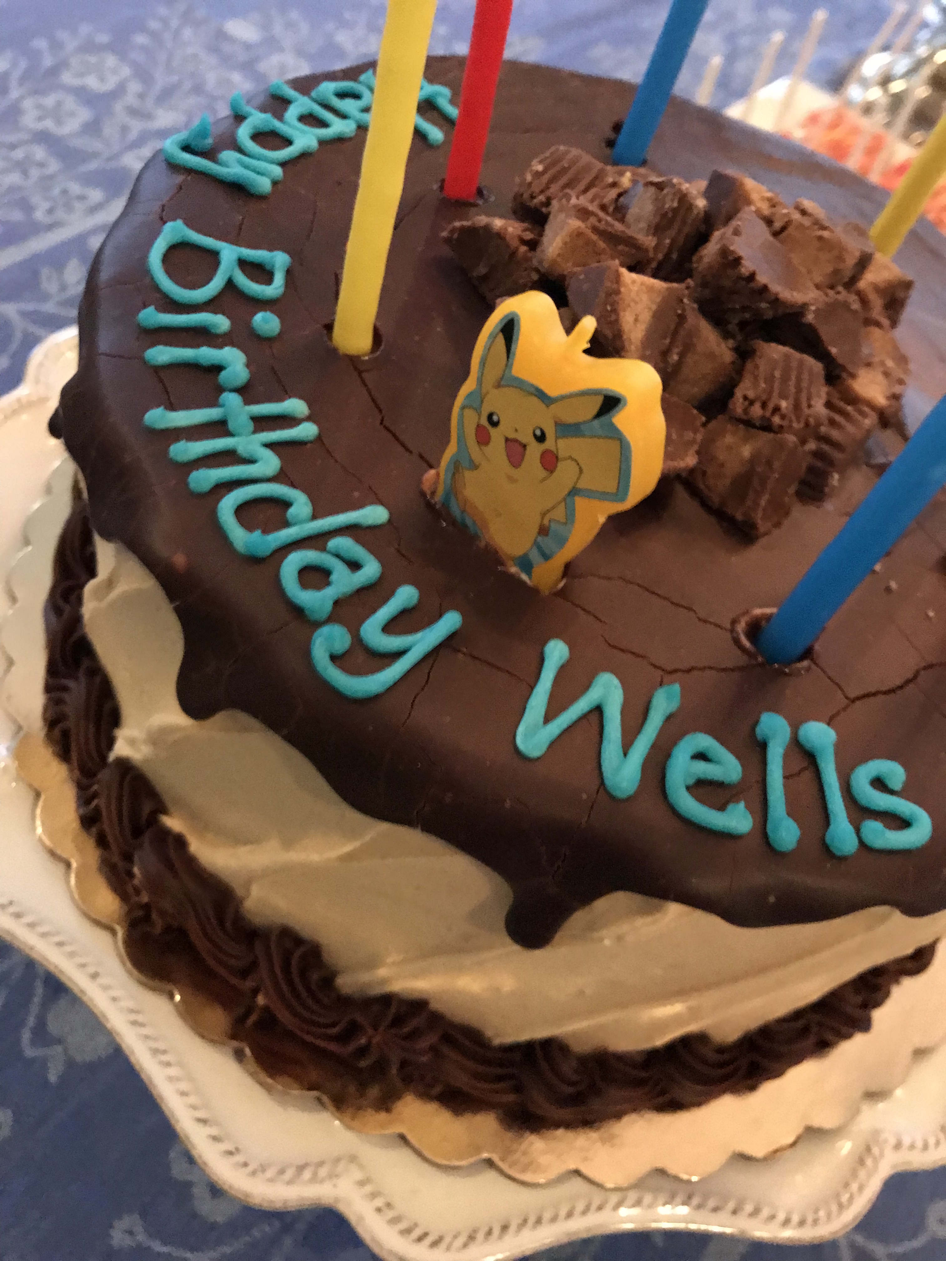 - Family birthday party with a Pokémon theme and a peanut butter cup cake