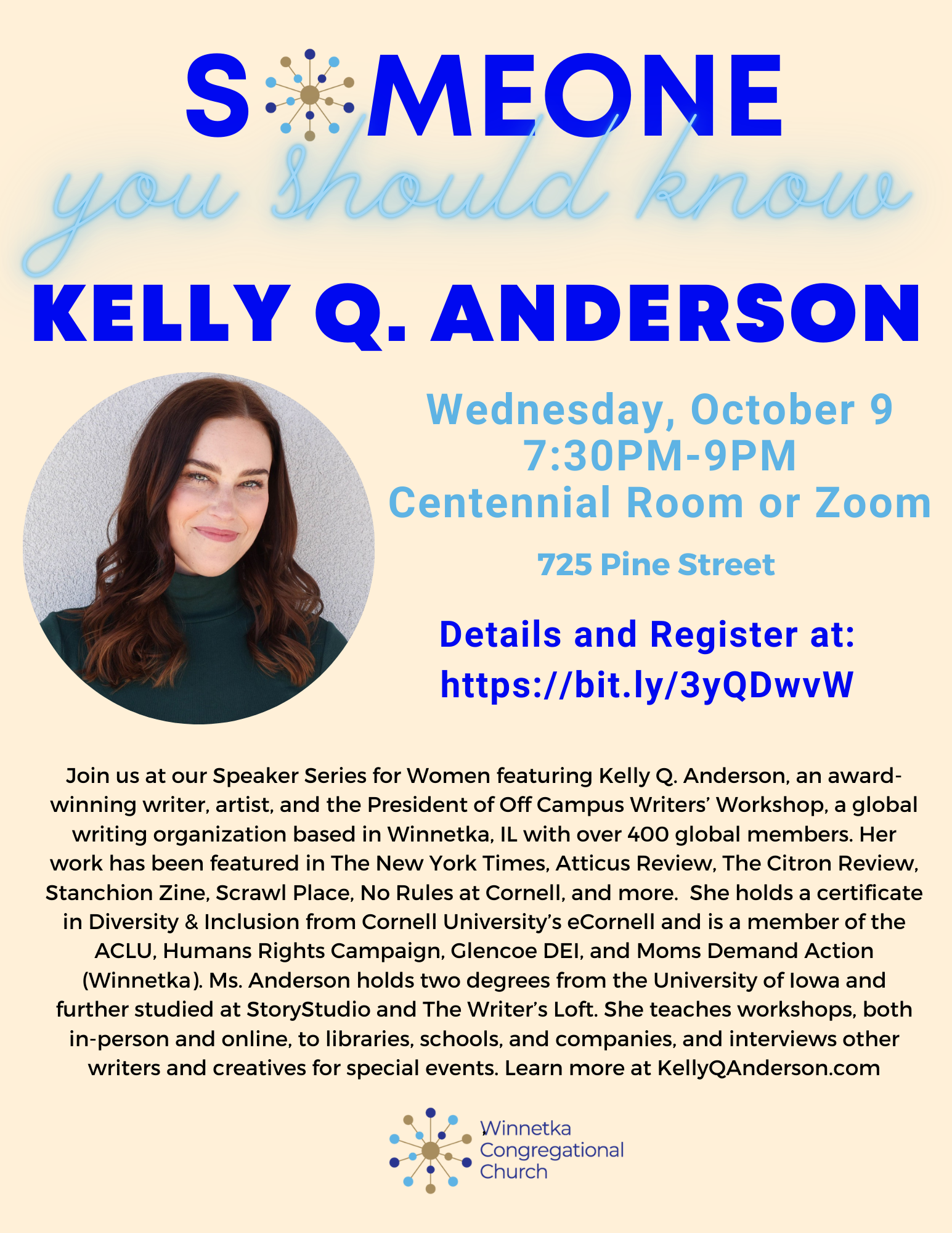 I’m thrilled to be the featured speaker in a unique series hosted by WCC (725 Pine Street) in Winnetka, IL. On Wednesday, Oct. 9th at 7pm, I will host a storytelling event regarding my life and career as a writer, columnist, artist, writing workshop President, and (newly) film producer. Attendees will receive complimentary #FlashCardsByKQA art prints.